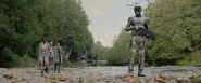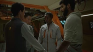 Upon arrival at the destroyed DeltFall habitat, the group lands near a lake and proceeds cautiously. Murderbot leads the entry into the structure due to his superior combat capabilities. Inside, he locates the damaged SecUnit previously seen at the end of Episode 2. Continuing his investigation, Murderbot finds the DeltFall team deceased.